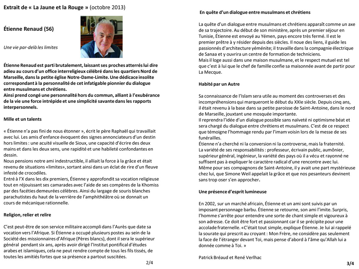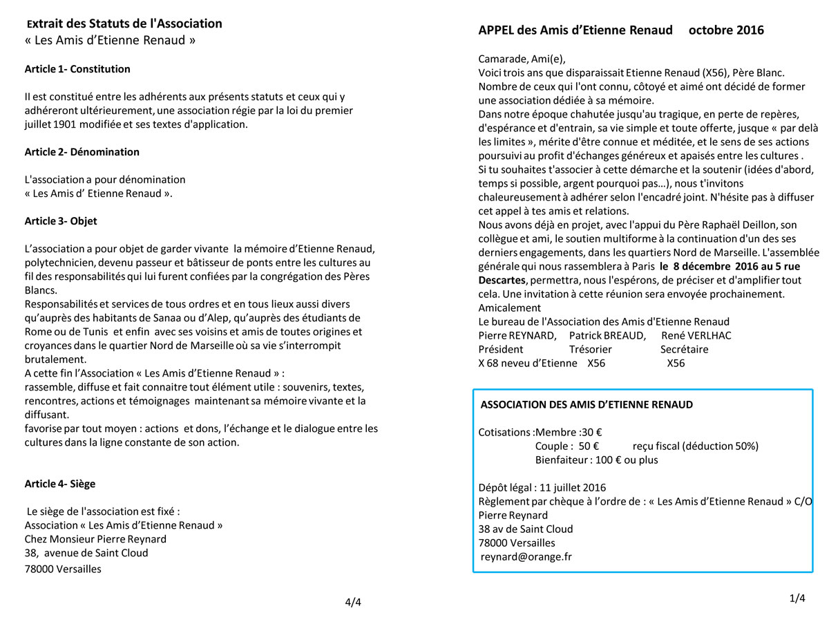| L’association des Amis d’Etienne Renaud a été créée en 2016, trois ans après son décès, à l’initiative de camarades polytechniciens d’Etienne qui, restés très attachés à lui, souhaitent garder vivante sa mémoire, notamment en soutenant le dialogue inter-religieux dans lequel il s’était tant engagé durant toute sa vie. L’association regroupe aussi des membres de sa nombreuse famille et des amis de toute provenance ; début 2017, l’association comptait déjà près de 70 membres. La première assemblée générale s’est tenue à Paris début décembre 2016 avec une trentaine de participants. Au cours de cette réunion, il a été décidé notamment de prendre en charge le loyer du local de la Cité de la Solidarité à Marseille Nord, pour y faire vivre un lieu interculturel commun avec la communauté musulmane du quartier, et de scanner et éditer différents documents, pour mise en ligne sur le présent site. L’association est prête à soutenir toute initiative s’inscrivant dans ses objectifs mentionnés à l’article 3 des statuts. > Télécharger appel de l'association (lisible ci dessous) | |||||
