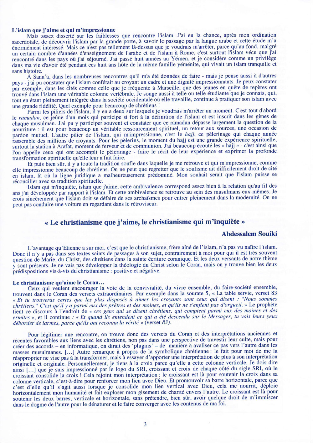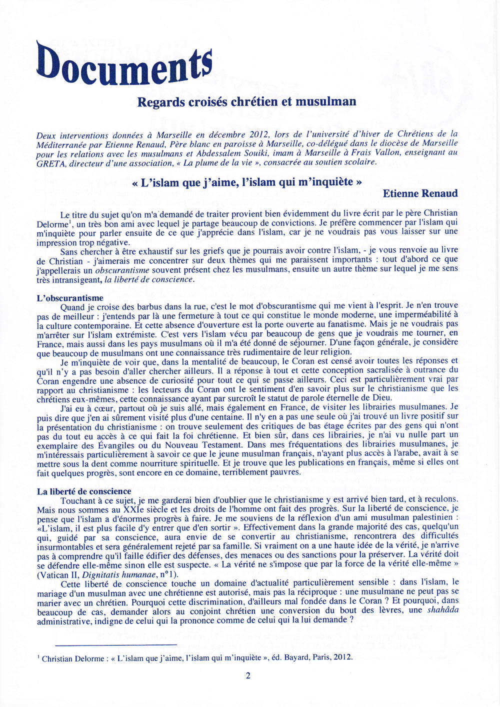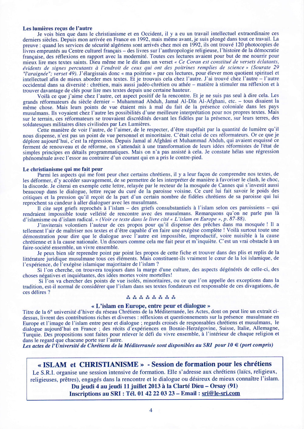"Regards croisés chrétien et musulman", lettre SRI n°115, juin 2013