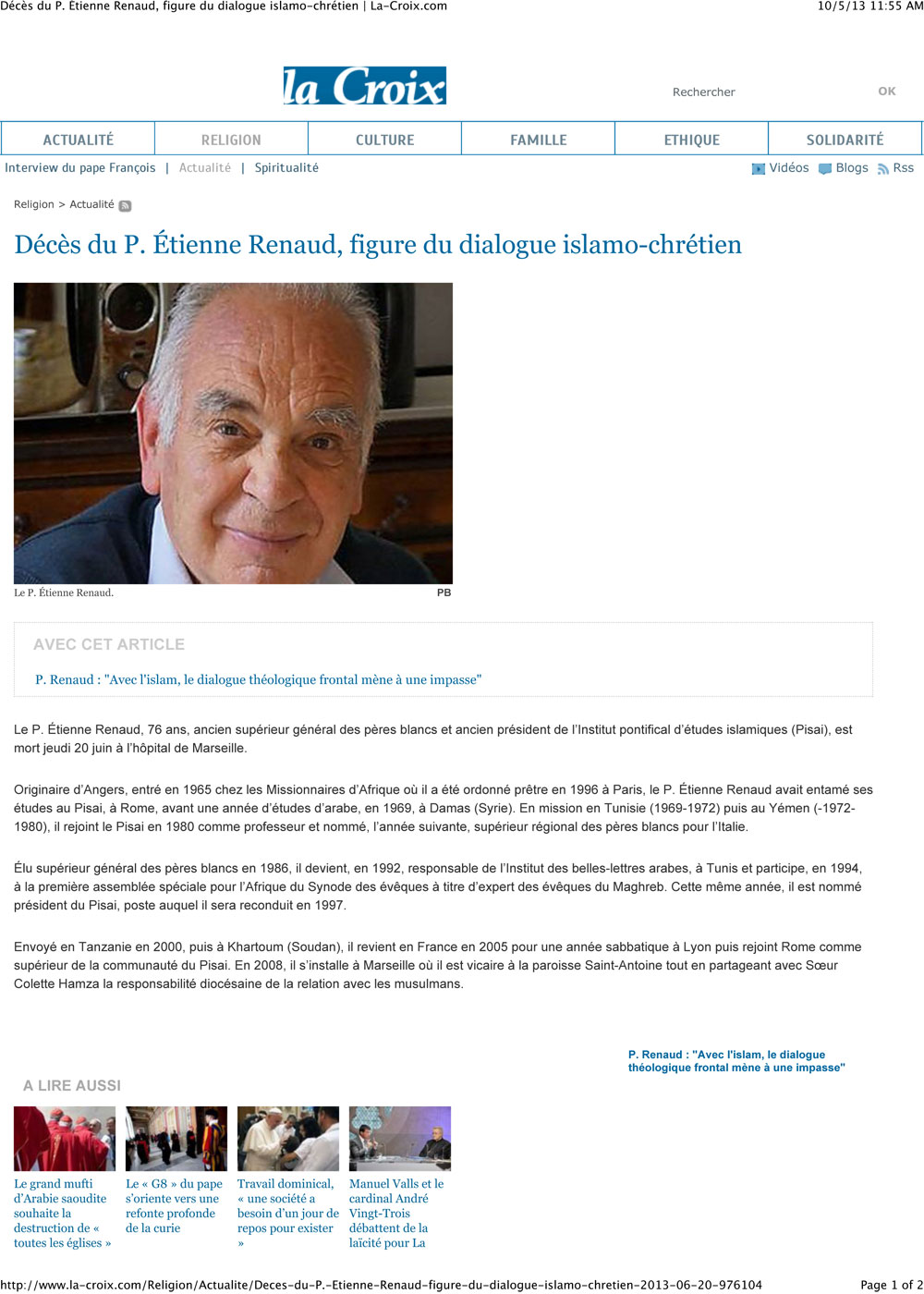 Décès de père Etienne Renaud, figure du dialogue islamo chrétien, 20 juin 2013