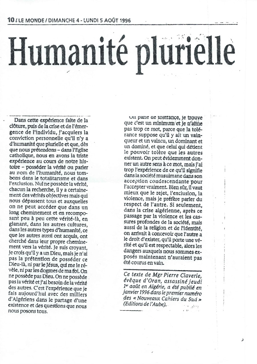 Un texte de Mgr Claverie auquel Etienne tenait beaucoup